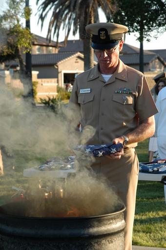 | Keywords: US Navy 100911-N-4033C-388 Master Chief Operations Specialist William Stewart places flags into a burn barrel during a flag retirement ceremony.jpg en SAN DIEGO Sept 11 2010 Master Chief Operations Specialist William Stewart places flags into a burn barrel during a flag retirement ceremony The sunset ceremony was held at the U S Navy and Coast Guard Vietnam Monument at Naval Amphibious Base Coronado and was hosted by the Naval Air Station North Island Chief Petty Officer's Association U S Navy photo by Mass Communication Specialist 2nd Class Jimmie Crockett/Released 2010-09-11 100911-N-4033C-388 Navy http //www navy mil/view_image asp id 91596 U S Navy photo by Mass Communication Specialist 2nd Class Jimmie Crockett PD-USGov-Military-Navy Vietnam Unit Memorial Monument Flag Retirement Ceremony |