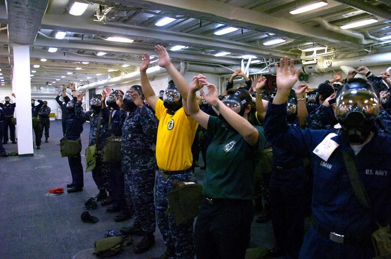 | Keywords: US Navy 100914-N-2515C-097 Sailors raise their arms, signifying that they have successfully donned their MCU-2P gas mask during chemical, biologica.jpg  en SAN DIEGO Sept 14 2010 Sailors raise their arms signifying that they have successfully donned their MCU-2P gas mask during chemical biological and radiological CBR training aboard the amphibious transport dock USS Green Bay LPD 20 The CBR training was held in preparation for the upcoming Unit-Level Training Assessment-Certification Ultra-C U S Navy photo by Mass Communication Specialist 1st Class Larry S Carlson/Released 2010-09-14 100914-N-2515C-097 Navy http //www navy mil/view_image asp id 91795 U S Navy photo by Mass Communication Specialist 1st Class Larry S Carlson PD-USGov-Military-Navy Aboard USS Green Bay LPD-20 MCU-2/P Protective Mask |