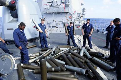 Keywords: US Navy 101027-N-8913A-415 Sailors aboard the guided-missile destroyer USS Mitscher (DDG 57) recover 5-inch Mark 45-54-caliber lightweight gun casi.jpg en ATLANTIC OCEAN Oct 27 2010 Sailors aboard the guided-missile destroyer USS Mitscher DDG 57 recover 5-inch Mark 45/54-caliber lightweight gun casings after a sinking exercise Mitscher and other ships assigned to the George H W Bush Carrier Strike Group fired live ammunition at the ex-Saturn U S Navy photo by Mass Communication Specialist Seaman Leonard Adams/Released 2010-10-27 101027-N-8913A-415 Navy http //www navy mil/view_image asp id 93412 U S Navy photo by Mass Communication Specialist Seaman Leonard Adams PD-USGov-Military-Navy Aboard USS Mitscher DDG-57 5 /54 caliber Mark 45 gun Cartridge cases