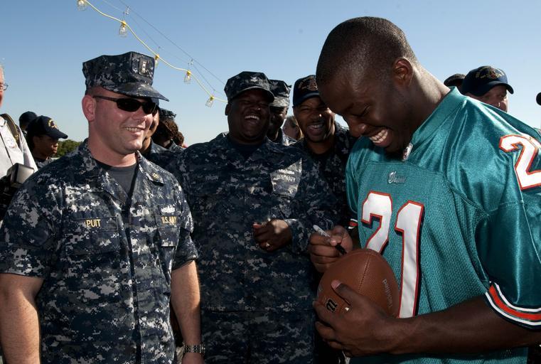 | Keywords: US Navy 101109-N-7948C-094 Miami Dolphin cornerback Vontae Davis signs a football for Chief Warrant Officer 2nd Mike Puit during a tour of the guid.jpg en FT LAUDERDALE Fla Nov 9 2010 Miami Dolphin cornerback Vontae Davis signs a football for Chief Warrant Officer 2nd Mike Puit during a tour of the guided-missile destroyer Pre-Commissioning Unit PCU Jason Dunham DDG 109 The Arleigh Burke-class ship is in port to prepare for a commissioning ceremony Nov 13 The ship is named after U S Marine Cpl Jason Dunham who was mortally wounded by insurgents in Iraq in April 2004 and was posthumously awarded the Medal of Honor Jan 11 2007 U S Navy photo by Mass Communication Specialist 1st Class Martin Cuaron/Released 2010-11-09 101109-N-7948C-094 Navy http //www navy mil/view_image asp id 93999 U S Navy photo by Mass Communication Specialist 1st Class Martin Cuaron PD-USGov-Military-Navy Images from US Navy location Fort Lauderdale Fla USS Jason Dunham DDG-109 Vontae Davis American football players giving autographs |