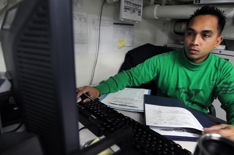 Keywords: US Navy 101113-N-9132C-053 Aviation Boatswain's Mate 1st Class Rick Maghanoy, from Temecula, Calif., processes a leave form in the air department V.jpg en PACIFIC OCEAN Nov 13 2010 Aviation Boatswain's Mate 1st Class Rick Maghanoy from Temecula Calif processes a leave form in the air department V-2 division administration office aboard the aircraft carrier USS Ronald Reagan CVN 76 Ronald Reagan is underway completing a composite training unit exercise in preparation for an upcoming deployment U S Navy photo by Mass Communication Specialist 3rd Class Oliver Cole/Released 2010-11-13 101113-N-9132C-053 Navy http //www navy mil/view_image asp id 94120 U S Navy photo by Mass Communication Specialist 3rd Class Oliver Cole PD-USGov-Military-Navy Aboard USS Ronald Reagan CVN-76 |