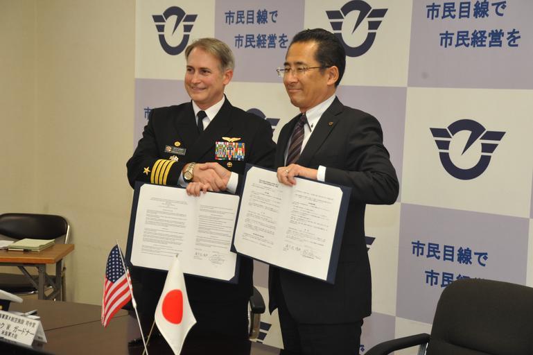 Keywords: US Navy 101117-N-8730P-146 Capt. Eric Gardner, left, commanding officer of Naval Air Facility Atsugi, and Fujisawa City Mayor Yasunori Ebine shake.jpg en FUJISAWA Japan Nov 17 2010 Capt Eric Gardner left commanding officer of Naval Air Facility Atsugi and Fujisawa City Mayor Yasunori Ebine shake hands after signing a memorandum of understanding at Fujisawa City Hall The memorandum outlines what Naval Air Facility Atsugi can do for Fujisawa City during and after major crises such as a typhoon or earthquake The three-year goal for the naval air facility is to have a signed memorandum of understanding with all of the cities surrounding the installation U S Navy photo by Mass Communication Specialist 1st Class Charles Panter/Released 2010-11-17 101117-N-8730P-146 Navy http //www navy mil/view_image asp id 94264 U S Navy photo by Mass Communication Specialist 1st Class Charles Panter PD-USGov-Military-Navy Images from US Navy location FUJISAWA Japan Mayors of Japan |