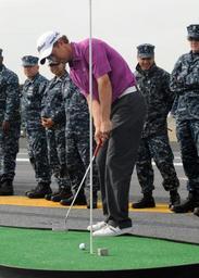 Keywords: US Navy 110125-N-4590G-084 Professional golfer Bryce Molder putts on the flight deck of the aircraft carrier USS Ronald Reagan (CVN 76).jpg en SAN DIEGO Jan 25 2011 Professional golfer Bryce Molder putts on the flight deck of the aircraft carrier USS Ronald Reagan CVN 76 The putting challenge was part of Play for L A an 18-day promotional event culminating in the Northern Trust Open golf tournament on February 15 Ronald Reagan is at homeport in San Diego preparing for an upcoming deployment U S Navy photo by Mass Communication Specialist Seaman Nicholas A Groesch/Released 2011-01-25 110125-N-4590G-084 Navy http //www navy mil/view_image asp id 96777 U S Navy photo by Mass Communication Specialist Seaman Nicholas A Groesch PD-USGov-Military-Navy Guests aboard USS Ronald Reagan CVN-76 |