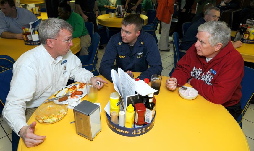 | Keywords: US Navy 110206-N-6632S-579 Operations Specialist Senior Chief Brett Richmond peaks with U.S. Reps. Todd Platts, left, and Mo Brooks.jpg en ATLANTIC OCEAN Feb 6 2011 Operations Specialist Senior Chief Brett Richmond center assigned to the operations department of the aircraft carrier USS George H W Bush CVN 77 speaks with U S Reps Todd Platts D-Pa left and Mo Brooks R-Ala in the Chief Petty Officers' Mess George H W Bush is underway in the Atlantic Ocean conducting a composite training unit exercise U S Navy photo by Mass Communication Specialist 3rd Class Kevin J Steinberg/Released 2011-02-06 110206-N-6632S-579 Navy http //www navy mil/view_image asp id 97336 U S Navy photo by Mass Communication Specialist 3rd Class Kevin J Steinberg PD-USGov-Military-Navy Aboard USS George H W Bush CVN-77 Todd Platts Mo Brooks |