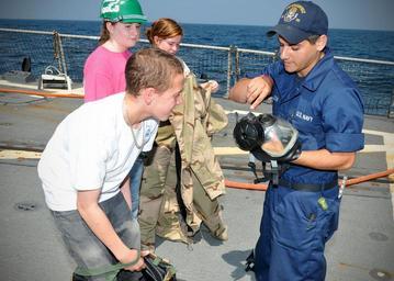 | Keywords: US Navy 110324-N-AW702-006 Damage Controlman Fireman Joe Hellow explains the importance of Mission Oriented Protective Posture (MOPP) gear to Rafea.jpg  en ATLANTIC OCEAN March 24 2011 Damage Controlman Fireman Joe Hellow explains the importance of Mission Oriented Protective Posture MOPP gear to Rafeal Fernandez a guest aboard the guided missile destroyer USS Roosevelt DDG 80 Fernandez is participating in the friends and family cruise where guests learn experience life aboard a U S Navy vessel U S Navy photo by Mass Communication Specialist 2nd Class Jacob Sippel/Released 2011-03-24 110324-N-AW702-006 Navy http //www navy mil/view_image asp id 99147 U S Navy photo by Mass Communication Specialist 2nd Class Jacob Sippel PD-USGov-Military-Navy Aboard USS Roosevelt DDG-80 Mission Oriented Protective Posture MCU-2/P Protective Mask |