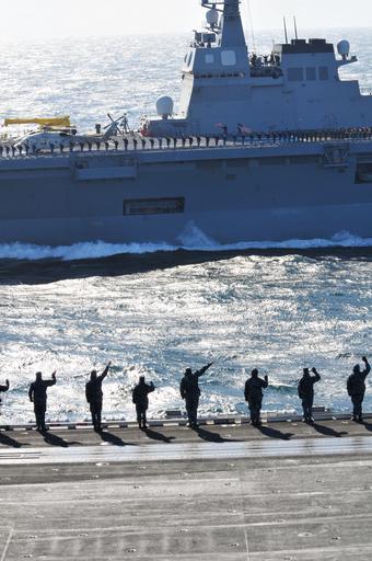 | Keywords: US Navy 110404-N-DM338-398 Sailors and Marines aboard USS Ronald Reagan (CVN 76) wave to Japanese sailors aboard JDS Hyuga (DDH 181) during a pass.jpg en PACIFIC OCEAN April 4 2011 Sailors and Marines aboard the aircraft carrier USS Ronald Reagan CVN 76 wave to Japanese sailors aboard the Japan Maritime Self-Defense Force helicopter destroyer JDS Hyuga DDH 181 during a pass and review Ronald Reagan is operating off the coast of Japan providing disaster relief and humanitarian assistance as directed in support of Operation Tomodachi U S Navy photo by Mass Communication Specialist Seaman Nicholas A Groesch/Released 2011-04-04 110404-N-DM338-398 Navy http //www navy mil/view_image asp id 99435 U S Navy photo by Mass Communication Specialist Seaman Nicholas A Groesch PD-USGov-Military-Navy Manning the rail on USS Ronald Reagan CVN-76 JS Hyƫga DDH-181 |