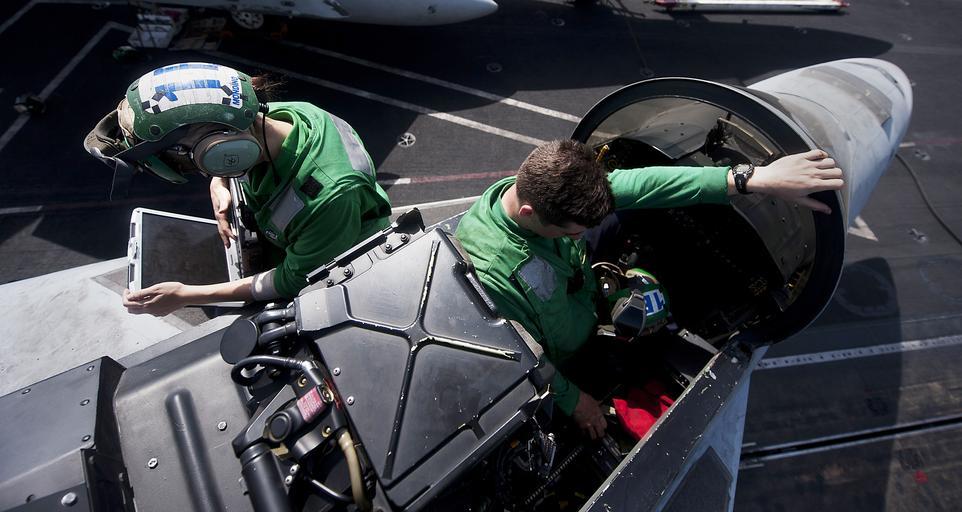 Keywords: US Navy 110429-N-2055M-112 Sailors perform maintenance on an F-A-18F Super Hornet.jpg en ARABIAN SEA April 29 2011 Aviation Electrician's Mate 2nd Class Amanda Mondino assigned to Strike Fighter Squadron VFA 22 reads technical publications on a laptop to Aviation Electrician's Mate Airman Christopher Carter as they perform maintenance on an F/A-18F Super Hornet aboard the Nimitz-class aircraft carrier USS Carl Vinson CVN 70 Carl Vinson and Carrier Air Wing CVW 17 are conducting maritime security operations and close-air support missions in the U S 5th Fleet area of responsibility U S Navy photo by Mass Communication Specialist 3rd Class Travis K Mendoza/Released 2011-04-29 110429-N-2055M-112 Navy http //www navy mil/view_image asp id 100476 U S Navy photo by Mass Communication Specialist 3rd Class Travis K Mendoza PD-USGov-Military-Navy Aboard USS Carl Vinson CVN-70 |