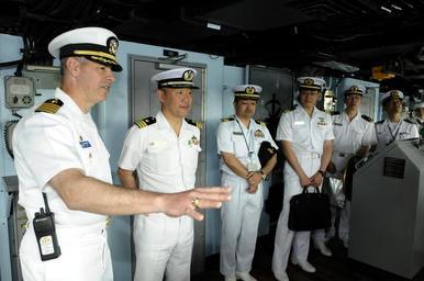| Keywords: US Navy 110517-N-VJ282-097 Capt. Dan Grieco discusses operational capabilities with Cmdr. Hideki Sekigawa aboard SS Blue Ridge (LCC 19).jpg en YOKOSUKA Japan May 17 2011 Capt Dan Grieco commanding officer of the U S 7th Fleet command ship USS Blue Ridge LCC 19 discusses operational capabilities with Cmdr Hideki Sekigawa commanding officer of the Japan Maritime Self-Defence ship JS Hatakaze DD 171 The operations and radio crew of Hatakaze is visiting Blue Ridge for a subject matter expert exchange U S Navy photo by Mass Communication Specialist 2nd Class Brian Dietrick/Released 2011-05-17 110517-N-VJ282-097 Navy http //www navy mil/view_image asp id 101023 U S Navy photo by Mass Communication Specialist 2nd Class Brian Dietrick PD-USGov-Military-Navy Aboard USS Blue Ridge LCC-19 Naval officers of the JMSDF |