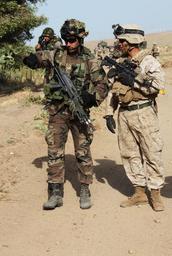 | Keywords: US Navy 110625-M-EK802-058 U.S. and Spanish marines conduct improvised explosive device training.jpg  en SIERRA DEL RETIN Spain June 23 2011 Frank Rodriguez left a Spanish marine assigned to Spain's Third Mechanized Landing Battalion points out an improvised explosive device indicator to U S Marine Lance Cpl Jhosue M Escate a squad automatic weapon gunner assigned to Light Armored Reconnaissance Platoon Weapons Company Battalion Landing Team 2nd Battalion 2nd Marine Regiment 22nd Marine Expeditionary Unit during counter improvised explosive device training The training is part of the Spanish Amphibious Bilateral Exercise a 10-day exercise intended to increase interoperability between U S and Spanish marines U S Marine Corps photo by Cpl Dwight Henderson/Released 2011-06-23 110625-M-EK802-058 Navy http //www navy mil/view_image asp id 103488 U S Marine Corps photo by Cpl Dwight Henderson PD-USGov-Military-Navy Images from US Navy location SIERRA DEL RETIN Spain 22nd Marine Expeditionary Unit Spanish Navy Marines June 2011 in Spain M4 carbine with blank-firing adaptor |
