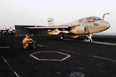 | Keywords: US Navy 110625-N-UO379-039 An EA-6B Prowler assigned to the Cougars of Tactical Electronic Warfare Squadron (VAQ) 139 launches from the aircraft ca.jpg en ARABIAN SEA June 25 2011 An EA-6B Prowler assigned to the Cougars of Tactical Electronic Warfare Squadron VAQ 139 launches from the aircraft carrier USS Ronald Reagan CVN 76 Ronald Reagan and Carrier Air Wing CVW 14 are deployed to the U S 5th Fleet area of responsibility conducting close-air support missions as part of Operation Enduring Freedom U S Navy photo by Mass Communication Specialist 3rd Class Alexander Tidd/Released 2011-06-25 110625-N-UO379-039 Navy http //www navy mil/view_image asp id 103288 U S Navy photo by Mass Communication Specialist 3rd Class Alexander Tidd PD-USGov-Military-Navy Aircraft launches from USS Ronald Reagan CVN-76 Electronic Attack Squadron 139 United States Navy |