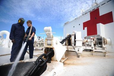 Keywords: US Navy 110627-N-NY820-071 Civil service mariner Able Seaman Erwin Joiner and Lt. Erinn Gelakoska clean debris from the anchor chain as it is hoist.jpg en SAN JUAN DEL SUR Nicaragua June 27 2011 Civil service mariner Able Seaman Erwin Joiner and Lt Erinn Gelakoska clean debris from the anchor chain as it is hoisted aboard the Military Sealift Command hospital ship USNS Comfort T-AH 20 while preparing to depart San Juan del Sur during Continuing Promise 2011 Continuing Promise is a five-month humanitarian assistance mission to the Caribbean Central and South America U S Navy photo by Mass Communication Specialist 2nd Class Eric C Tretter/Released 2011-06-27 110627-N-NY820-071 Navy http //www navy mil/view_image asp id 103329 U S Navy photo by Mass Communication Specialist 2nd Class Eric C Tretter PD-USGov-Military-Navy Aboard USNS Comfort T-AH-20 |