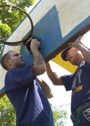 Keywords: US Navy 110629-N-VY256-066 A U.S. Navy and an Armed Forces of the Philippines Navy sailor replace a basketball goal during a community service proj.jpg en PUERTO PRINCESA Philippines June 29 2011 Engineman 3rd Class Ryan Fortune assigned to the guided-missile destroyer USS Chung-Hoon DDG 93 and an Armed Forces of the Philippines Navy sailor replace a basketball goal during a community service project at Tagburos Elementary School Sailors from Chung-Hoon are supporting Cooperation Afloat Readiness and Training CARAT Philippines 2011 a series of bilateral exercises held annually in Southeast Asia to strengthen relationships and enhance force readiness U S Navy photo by Mass Communication Specialist 3rd Class Christopher S Johnson/Released 2011-06-29 110629-N-VY256-066 Navy http //www navy mil/view_image asp id 103416 U S Navy photo by Mass Communication Specialist 3rd Class Christopher S Johnson PD-USGov-Military-Navy Aboard Chung-Hoon DDG-93 |