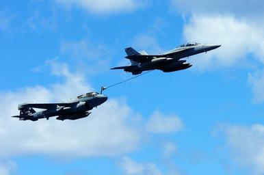 | Keywords: US Navy 110904-N-UO379-071 An EA-6B Prowler and an F-A-18F Super Hornet demonstrate a mid-air refueling evolution as they fly near USS Ronald Reaga.jpg en PACIFIC OCEAN Sept 4 2011 An EA-6B Prowler assigned to the Cougars of Tactical Electronic Warfare Squadron VAQ 139 and an F/A-18F Super Hornet assigned to the Black Knights of Strike Fighter Squadron VFA 154 demonstrate a mid-air refueling evolution as they fly near the aircraft carrier USS Ronald Reagan CVN 76 during a tiger cruise Ronald Reagan is returning from a seven-month deployment U S Navy photo by Mass Communication Specialist 3rd Class Alexander Tidd/Released 2011-09-04 110904-N-UO379-071 Navy http //www navy mil/view_image asp id 106852 U S Navy photo by Mass Communication Specialist 3rd Class Alexander Tidd PD-USGov-Military-Navy Aboard USS Ronald Reagan CVN-76 Grumman EA-6 Prowler in flight Aerial refueling by F/A-18F Super Hornet Strike Fighter Squadron 154 United States Navy Electronic Attack Squadron 139 United States Navy |