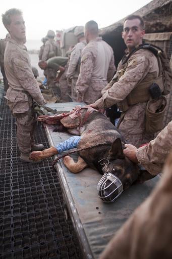 | Keywords: US Navy 110908-M-EU691-042 U.S. Marines from 1st Battalion, 5th Marines, Regimental Combat Team 8, carry an injured bomb-tracking dog.jpg  en SANGIN Afghanistan Sept 8 2011 U S Marines from 1st Battalion 5th Marines Regimental Combat Team 8 carry an injured bomb-tracking dog to an awaiting helicopter at Forward Operating Base Jackson The Marines and Afghan Uniformed Policeman were struck by a suicide bomber using a vehicle-borne improvised explosive device while on a patrol U S Marine Corps photo by Cpl Logan W Pierce/Released 2011-09-08 110908-M-EU691-042 Navy http //www navy mil/view_image asp id 107566 U S Marine Corps photo by Cpl Logan W Pierce PD-USGov-Military-Navy Forward Operating Base Jackson Wounded dogs Detection dogs Military working dogs of the United States in the War in Afghanistan 2001-present Dog muzzles Lying dogs sideways  |