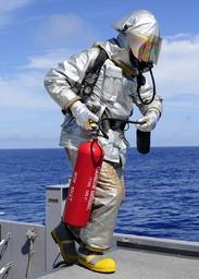 | Keywords: US Navy 110927-N-WJ771-100 Aviation Support Equipment Technician 2nd Class Joshua B. Cary carries a CO2 fire extinguisher onto the flight deck of U.jpg en EAST CHINA SEA Sept 27 2011 Aviation Support Equipment Technician 2nd Class Joshua B Cary carries a CO2 fire extinguisher onto the flight deck of the forward-deployed amphibious transport dock ship USS Denver LPD 9 during crash and salvage endurance training Denver is part of the Essex Amphibious Ready Group and is conducting operations in the western Pacific U S Navy photo by Mass Communication Specialist 2nd Class Casey H Kyhl/Released 2011-09-27 110927-N-WJ771-100 Navy http //www navy mil/view_image asp id 107920 U S Navy photo by Mass Communication Specialist 2nd Class Casey H Kyhl PD-USGov-Military-Navy Aboard USS Denver LPD-9 Fire proximity suits People using fire extinguishers Carbon dioxide fire extinguishers Color gradient Yellow shoes |