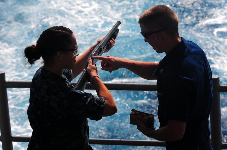 Keywords: US Navy 111031-N-UO379-126 Gunner's Mate 3rd Class John Thurman, from Riverside, Calif., instructs Interior Communications Specialist 3rd Class Jes.jpg en PACIFIC OCEAN Oct 31 2011 Gunner's Mate 3rd Class John Thurman from Riverside Calif instructs Interior Communications Specialist 3rd Class Jessica Cuadrado from Newark N J on the proper firing technique of a Mossberg 500 shotgun on the fantail of the aircraft carrier USS Ronald Reagan CVN 76 during a weapons handling evolution Ronald Reagan is conducting routine training in the eastern Pacific Ocean Ronald Reagan is homeported in San Diego U S Navy photo by Mass Communication Specialist 3rd Class Alexander Tidd/Released 2011-10-31 111031-N-UO379-126 Navy http //www navy mil/view_image asp id 109866 U S Navy photo by Mass Communication Specialist 3rd Class Alexander Tidd PD-USGov-Military-Navy Firearms training on USS Ronald Reagan CVN-76 Mossberg 500 |