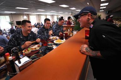 Keywords: US Navy 111102-N-YR391-064 Celebrity chef Mike Hardin talks with Sailors.jpg en MAYPORT Fla Nov 2 2011 Celebrity chef Mike Hardin who appeared on the Food Network television program Diners Drive-Ins and Dives asks Electronics Technician 2nd Class Ryan Perry how his food tastes during a special lunchtime meal for Sailors at Naval Station Mayport The lunch is sponsored by Morale Welfare and Recreation U S Navy photo by Mass Communication Specialist 2nd Class Gary Granger Jr /Released 2011-11-02 111102-N-YR391-064 Navy http //www navy mil/view_image asp id 109826 U S Navy photo by Mass Communication Specialist 2nd Class Gary Granger Jr PD-USGov-Military-Navy Naval Station Mayport |