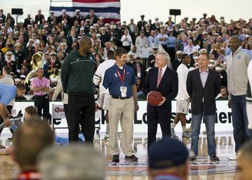| Keywords: US Navy 111111-N-AC887-005 Secretary of the Navy (SECNAV) the Honorable Ray Mabus stood center court with a wounded warrior, left, Earvin.jpg  en SAN DEIGO Nov 11 2011 Secretary of the Navy SECNAV the Honorable Ray Mabus stood center court with a wounded warrior left Earvin Magic Johnson far left and James Worthy far right to start the first-ever Carrier Classic basketball game aboard the Nimitz-class aircraft carrier USS Carl Vinson CVN 70 The NCAA Division I top-ranked North Carolina Tar Heels defeated the Spartans from Michigan State University 67-55 U S Navy photo by Chief Mass Communication Specialist Sam Shavers/Released 2011-11-11 111111-N-AC887-005 Navy http //www navy mil/view_image asp id 110322 U S Navy photo by Chief Mass Communication Specialist Sam Shavers PD-USGov-Military-Navy Aboard USS Carl Vinson CVN-70 Carrier Classic Magic Johnson James Worthy Ray Mabus |