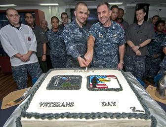 | Keywords: US Navy 111111-N-ER662-453 Seaman Peter Achterberg and Capt. David Fluker cut a cake during a Veterans Day celebration on the mess decks.jpg en CELEBES SEA Nov 11 2011 Seaman Peter Achterberg and Capt David Fluker commanding officer of amphibious assault ship USS Essex LHD 2 cut a cake during a Veterans Day celebration on the mess decks Essex is part of the Essex Amphibious Ready Group and is conducting operations in the western Pacific region U S Navy photo by Mass Communication Specialist 3rd Class Matthew R Cole/Released 2011-11-11 111111-N-ER662-453 Navy http //www navy mil/view_image asp id 110358 U S Navy photo by Mass Communication Specialist 3rd Class Matthew R Cole PD-USGov-Military-Navy Aboard USS Essex LHD-2 Cake cutting |