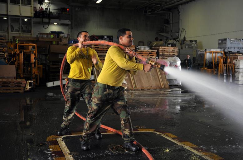 Keywords: US Navy 111118-N-ZZ999-021 Airman Leandro Chong and Aviation Boatswain's Mate Handling 3rd Class Bryan Sebastian spray water in the hangar bay aboa.jpg en PACIFIC OCEAN Nov 18 2011 Airman Leandro Chong and Aviation Boatswain's Mate Handling 3rd Class Bryan Sebastian spray water in the hangar bay aboard the aircraft carrier USS George Washington CVN 73 during a routine cleaning George Washington is conducting a patrol in the western Pacific Ocean U S Navy photo by Mass Communication Specialist 3rd Class David Cox/Released 2011-11-18 111118-N-ZZ999-021 Navy http //www navy mil/view_image asp id 110832 U S Navy photo by Mass Communication Specialist 3rd Class David Cox PD-USGov-Military-Navy Aboard USS George Washington CVN-73 Fire hoses |