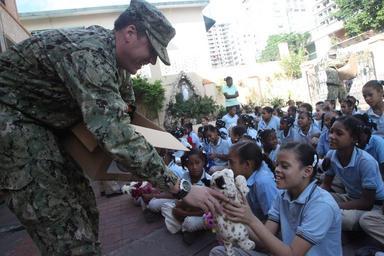 Keywords: US Navy 111125-A-IP644-019 A Sailor distributes.jpg en SANTO DOMINGO Dominican Republic Nov 25 2011 Hospital Corpsman 3rd Class Adam Carlucci part of the Maritime Civil Affairs Team MCAT assigned to High Speed Vessel HSV 2 Swift distributes Loving Hugs stuffed animals to children at Hogar Escuela De Ninas Dona Chucha during a Southern Partnership Station community service event Swift has been working with military and community partners for the past three weeks to build partnerships throughout the country U S Army photo by Spc Jennifer Grier/Released 2011-11-25 111125-A-IP644-019 Navy http //www navy mil/view_image asp id 111050 U S Army photo by Spc Jennifer Grier PD-USGov-Military-Navy Images from US Navy location Santo Domingo Dominican Republic Children of the Dominican Republic |