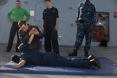 Keywords: US Navy 111201-N-PB383-425 Hull Technician Fireman Nicholas Ardoin puts Engineman 3rd Class Phillip Nieves into an arm restraint during a self-defe.jpg en PACIFIC OCEAN Dec 1 2011 Hull Technician Fireman Nicholas Ardoin puts Engineman 3rd Class Phillip Nieves into an arm restraint during a self-defense course aboard the amphibious transport dock ship USS New Orleans LPD 18 New Orleans and embarked Marines assigned to the 11th Marine Expeditionary Unit 11th MEU are conducting operations in the U S 7th Fleet area of responsibility as part of the Makin Island Amphibious Ready Group U S Navy photo by Mass Communication Specialist 2nd Class Dominique Pineiro/Released 2011-12-01 111201-N-PB383-425 Navy http //www navy mil/view_image asp id 111271 U S Navy photo by Mass Communication Specialist 2nd Class Dominique Pineiro PD-USGov-Military-Navy Aboard USS New Orleans LPD-18 |