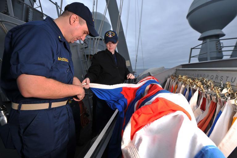 | Keywords: US Navy 111204-N-YZ751-060 Ensign Michael C. McDonald and Ensign Elyse Yarbrough prepare flags during a flag hoist training exercise aboard guided.jpg en ATLANTIC OCEAN Dec 4 2011 Ensign Michael C McDonald and Ensign Elyse Yarbrough prepare flags during a flag hoist training exercise aboard guided-missile destroyer USS Truxtun DDG 103 Truxtun is conducting a seven-month deployment to the U S 5th and 6th Fleet areas of responsibility U S Navy photo by Mass Communication Specialist 2nd Class Tony D Curtis/Released 2011-12-04 111204-N-YZ751-060 Navy http //www navy mil/view_image asp id 111483 U S Navy photo by Mass Communication Specialist 2nd Class Tony D Curtis PD-USGov-Military-Navy Aboard USS Truxtun DDG-103 |