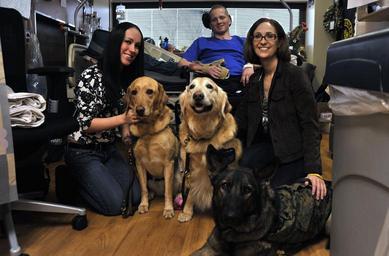 Keywords: US Navy 111205-N-RE933-019 Army Pfc. Derek McConnell and his family pet therapy dogs.jpg en BETHESDA Md Dec 5 2011 Therapy dogs Lt Cmdr Bobbie Rear Adm Laura Lee and Marine Sgt Archie pose for a photo with Army Pfc Derek McConnell and his fiancee Krystina Dressler and his mother Siobhan McConnell in McConnell's hospital room at Walter Reed National Military Medical Center The dogs visit daily with wounded warriors and their families and help with physical therapy U S Navy Photo by Mass Communication Specialist 1st Class Peggy Trujillo/Released 2011-12-05 111205-N-RE933-019 Navy http //www navy mil/view_image asp id 111510 U S Navy Photo by Mass Communication Specialist 1st Class Peggy Trujillo PD-USGov-Military-Navy National Naval Medical Center Therapy dogs Golden Retriever Yellow Labrador Retrievers German Shepherd Dog |