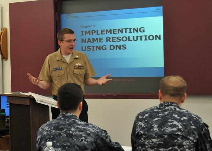 Keywords: US Navy 120201-N-UN340-018 Electronics Technician 2nd Class Jeremy Ruark, assigned to the Center for Information Dominance (CID) Learning Site, San.jpg en SAN DIEGO Feb 1 2012 Electronics Technician 2nd Class Jeremy Ruark assigned to the Center for Information Dominance CID Learning Site San Diego discusses Domain Name Server functions with students at Naval Computer and Telecommunications Station San Diego CID instructors train Sailors in the areas of cryptology information operations and information technology U S Navy photo by Rick Naystatt/Released 2012-02-01 120201-N-UN340-018 Navy http //www navy mil/view_image asp id 114849 U S Navy photo by Rick Naystatt PD-USGov-Military-Navy Images from US Navy location San Diego California |