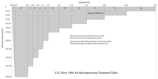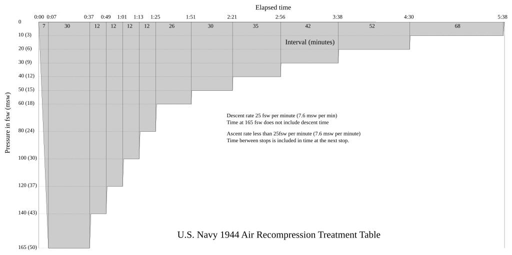 Keywords: US Navy 1944 165ft Air Recompression Treatment Table.svg en Graphic representation of the US Navy 1944 165ft Air Recompression Treatment Table 2016-03-28 own Peter Southwood other versions cc-zero Decompression tables