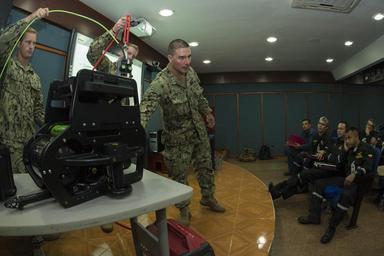Keywords: US Navy divers discuss their underwater robot with Colombian divers as part of Southern Partnership Station '14 140819-N-IP743-205.jpg en U S Navy divers assigned to Mobile Diving and Salvage Unit Two MDSU 2 Company 2-1 discuss their underwater robot with Colombian divers from the Departamento de Buceo y Salvamento The MDSU 2 divers are in Colombia working with the Armada de la Republica de Colombia as part of Southern Partnership Station 2014 Southern Partnership Station 2014 is a U S Navy deployment focused on subject matter expert exchanges with partner nation militaries and security forces in Central and South America and the Caribbean U S military teams work with partner nation forces during naval-focused training exercises military-to-military engagements and community relations projects in an effort to enhance partnerships with regional maritime activities and improve the operational readiness of participants U S Navy photo by Mass Communication Specialist 1st Class Brett Cote/Released 2014-08-19 Petty Officer 1st Class Brett Cote https //www dvidshub net/image/1516621 140819-N-IP743-205 2014-08-21 17 45 CARTAGENA CO PD-USGov-Military-Navy United States Navy Mobile Diving and Salvage Unit Two Southern Partnership Station 2014 Images from DoD uploaded by Fæ |
