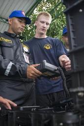 Keywords: US Navy divers discuss their underwater robot with Colombian divers as part of Southern Partnership Station '14 140820-N-IP743-036.jpg en Navy Diver 3rd Class Zoe Young assigned to Mobile Diving and Salvage Unit Two MDSU 2 Company 2-1 explains the controls of a remote operated underwater vehicle to a Colombian dive student from the Departamento de Buceo y Salvamento The MDSU 2 divers are in Colombia working with the Armada Republica Colombia as part of Southern Partnership Station 2014 Southern Partnership Station 2014 is a U S Navy deployment focused on subject matter expert exchanges with partner nation militaries and security forces in Central and South America and the Caribbean U S military teams work with partner nation forces during naval-focused training exercises military-to-military engagements and community relations projects in an effort to enhance partnerships with regional maritime activities and improve the operational readiness of participants U S Navy photo by Mass Communication Specialist 1st Class Brett Cote/Released 2014-08-20 Petty Officer 1st Class Brett Cote https //www dvidshub net/image/1516615 140820-N-IP743-036 2014-08-21 17 45 CARTAGENA CO PD-USGov-Military-Navy United States Navy Mobile Diving and Salvage Unit Two Southern Partnership Station 2014 Images from DoD uploaded by Fæ |