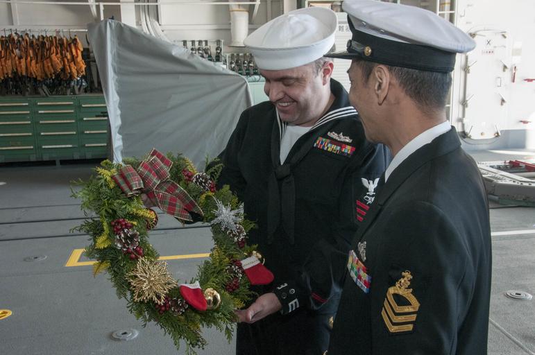 | Keywords: US Navy and Japan Maritime Self-Defense Force Sailors conduct sister ship tours 151218-N-RU971-084.jpg en 151218-N-RU971-084 SASEBO Japan Dec 18 2015 Mass Communication Specialist 1st Class Ty Connors forward-deployed amphibious assault ship USS Bonhomme Richard LHD 6 public affairs officer enlisted explains the meaning behind the holiday wreath to Japan Maritime Self Defense Force JMSDF Chief Petty Officer Hirosahi Nishitani in the hangar bay aboard Shirane-class destroyer JDS Kurama DDH 144 Bonhomme Richard is the lead ship of the Bonhomme Richard Amphibious Ready Group and is forward-deployed to Sasebo Japan in the U S 7th Fleet area of operations U S Navy Photo by Mass Communication Specialist 3rd Class Cameron McCulloch/Released <br>Unit USS Bonhomme Richard LHD 6 2015-12-18 Petty Officer 3rd Class Cameron McCulloch https //www dvidshub net/image/2341355/us-navy-and-japan-maritime-self-defense-force-sailors-conduct-sister-ship-tours 151218-N-RU971-084 2015-12-21 23 56 SASEBO NAGASAKI JP PD-USGov-Military-Navy JS Kurama DDH-144 USS Bonhomme Richard LHD-6 Images from DoD uploaded by FĂŚ |