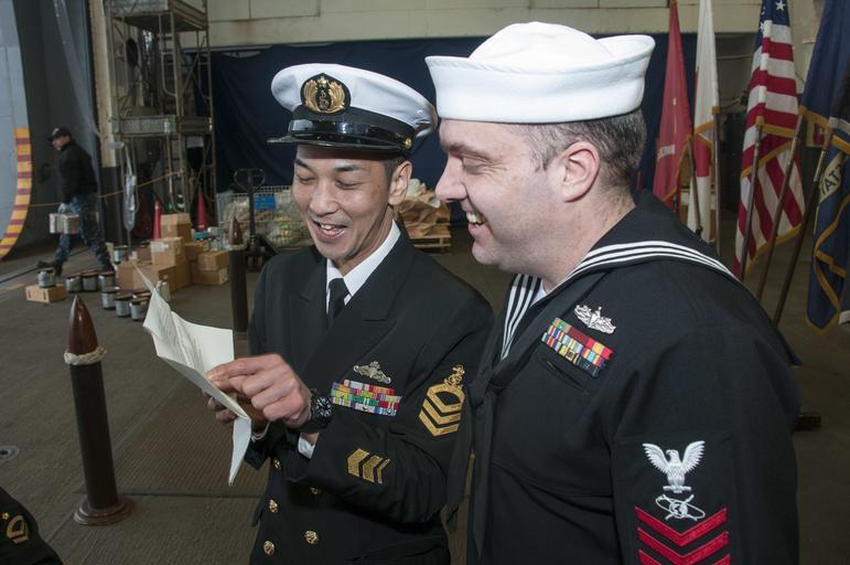 | Keywords: US Navy and Japan Maritime Self-Defense Force Sailors conduct sister ship tours 151218-N-RU971-639.jpg en 151218-N-RU971-639 SASEBO Japan Dec 18 2015 Japan Maritime Self-Defense Force JMSDF Chief Petty Officer Hirosahi Nishitani of Shirane-class destroyer JDS Kurama DDH 144 shows off his English by reading the meaning of a traditional rice cake to Mass Communication Specialist 1st Class Ty Connors forward-deployed amphibious assault ship USS Bonhomme Richard LHD 6 public affairs officer enlisted on the quarterdeck aboard Bonhomme Richard Bonhomme Richard is the lead ship of the Bonhomme Richard Amphibious Ready Group and is forward-deployed to Sasebo Japan in the U S 7th Fleet area of operations U S Navy Photo by Mass Communication Specialist 3rd Class Cameron McCulloch/Released <br>Unit USS Bonhomme Richard LHD 6 2015-12-18 Petty Officer 3rd Class Cameron McCulloch https //www dvidshub net/image/2341370/us-navy-and-japan-maritime-self-defense-force-sailors-conduct-sister-ship-tours 151218-N-RU971-639 2015-12-21 23 55 SASEBO NAGASAKI JP PD-USGov-Military-Navy JS Kurama DDH-144 USS Bonhomme Richard LHD-6 Images from DoD uploaded by FĂŚ |