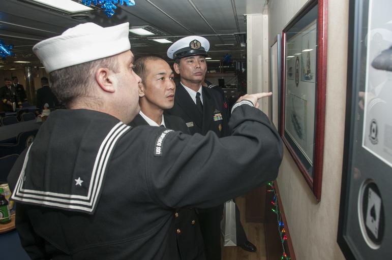 | Keywords: US Navy and Japan Maritime Self-Defense Force Sailors conduct sister ship tours 151218-N-RU971-501.jpg en 151218-N-RU971-501 SASEBO Japan Dec 18 2015 Mass Communication Specialist 1st Class Ty Connors forward-deployed amphibious assault ship USS Bonhomme Richard LHD 6 public affairs officer enlisted explains Bonhomme Richard history to Japan Maritime Self-Defense Force JMSDF Chief Hirosahi Nishitani front and Chief Petty Officer Ryuichi Rokutanzono of Shirane-class destroyer JDS Kurama DDH 144 in the wardroom aboard Bonhomme Richard Bonhomme Richard is the lead ship of the Bonhomme Richard Amphibious Ready Group and is forward-deployed to Sasebo Japan in the U S 7th Fleet area of operations U S Navy Photo by Mass Communication Specialist 3rd Class Cameron McCulloch/Released <br>Unit USS Bonhomme Richard LHD 6 2015-12-18 Petty Officer 3rd Class Cameron McCulloch https //www dvidshub net/image/2341365/us-navy-and-japan-maritime-self-defense-force-sailors-conduct-sister-ship-tours 151218-N-RU971-501 2015-12-21 23 57 SASEBO NAGASAKI JP PD-USGov-Military-Navy JS Kurama DDH-144 USS Bonhomme Richard LHD-6 Images from DoD uploaded by FĂŚ |