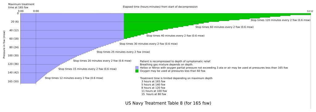 Keywords: US Navy Table 8 for 165fsw.svg en Graphic representation of US Navy Recompression Treatment Table 8 2015-11-11 own Pbsouthwood other versions cc-zero Decompression tables Uploaded with UploadWizard