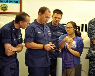 | Keywords: US Pacific Fleet and Office of Naval Research sponsor robotics competition, RIMPAC 2014 140705-N-UG232-003.jpg en Jennifer Loui a junior from Pearl City High School instructs Electronics Technician 3rd Class Thomson Butcher stationed onboard the USCGC Waesche WMSL 75 in operating the Pearl City team's entry in the robotics competition The competition sponsored by the U S Pacific Fleet and the Office of Naval Research gave students a chance to meet Rim of the Pacific RIMPAC Exercise 2014 participants and learn about the Navy while building skill proficiencies in Science Technology Engineering and Math STEM The world's largest international maritime exercise RIMPAC provides a unique training opportunity that helps participants foster and sustain the cooperative relationships that are critical to ensuring the safety of sea lanes and security on the world's oceans Twenty-two nations more than 49 ships six submarines more than 200 aircraft and 25 000 personnel are participating in RIMPAC U S Navy photo by Mass Communication Specialist 1st Class Martin Wright/Released 2014-07-05 Petty Officer 1st Class Martin Wright https //www dvidshub net/image/1439582 140705-N-UG232-003 2014-07-09 05 15 JOINT BASE PEARL HARBOR-HICKAM HI US PD-USGov-Military-Navy People at Joint Base Pearl Harbor-Hickam RIMPAC 2014 Office of Naval Research Images from DoD uploaded by Fæ |