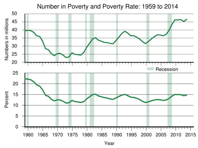 | Keywords: US Poverty.svg en Number in poverty and poverty rate in the United States from 1959 to 2014 Data from https //www census gov/content/dam/Census/library/publications/2015/demo/p60-252 pdf US Census Table B-1 pg 44 own Delphi234 2016-05-14 current annually Generated with Wikimedia SVG Chart SVG Chart/box Cc-zero Poverty in the United States |
