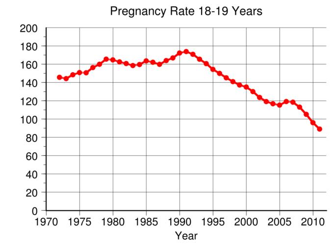 | Keywords: US Pregnancy Rate 18-19 Years.svg translate yes en Pregnancy rate per 1000 18-19 years old in the United States Data from http //www guttmacher org/pubs/USTPtrends10 pdf Table 2 3 pg 12 2015-01-23 own Delphi234 other versions Generated with Wikimedia SVG Chart SVG Chart/box cc-zero Human pregnancy |