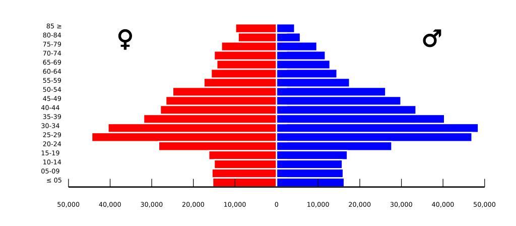 | Keywords: USA San Francisco County, California Population pyramid.svg Population growth of San Francisco California from 1850-2005 American Fact Finder http //factfinder census gov/servlet/DTTable _bm y -context dt -ds_name DEC_2000_SF1_U -mt_name DEC_2000_SF1_U_P012 -CONTEXT dt -tree_id 4001 -all_geo_types N -geo_id 05000US06075 -search_results 01000US -format -_lang en P12 SEX BY AGE 49 - Universe Total population - San Francisco County California Data used for this image Age Male Female 85 > 4357 -9870 80-84 5725 -9238 75-79 9709 -13257 70-74 11733 -14999 65-69 12851 -14372 60-64 14532 -15726 55-59 17557 -17469 50-54 26234 -24961 45-49 29900 -26623 40-44 33525 -27951 35-39 40376 -31952 30-34 48510 -40515 25-29 46970 -44423 20-24 27707 -28347 15-19 17024 -16310 10-14 15813 -15000 05-09 16030 -15534 < 05 16275 -15358 Created with Adobe Illustrator 2009-03-24 optigan13 File USA_San_Francisco_County _California_Population_pyramid png File USA San Francisco County California age pyramid svg Population pyramids of counties of California Demographics of San Francisco |
