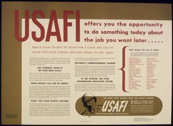 Keywords: USAFI OFFERS YOU THE OPPORTUNITY TO DO SOMETHING TODAY ABOUT THE JOB YOU WANT LATER... - NARA - 515893.jpg Scope and content General notes 515893 Local identifier 44-PA-2184 Office for Emergency Management Office of War Information Domestic Operations Branch Bureau of Special Services 03/09/1943 - 09/15/1945 Still Picture Records Section Special Media Archives Services Division NWCS-S National Archives at College Park 8601 Adelphi Road College Park MD 20740-6001 1941 - 1945 Record group Record Group 44 Records of the Office of Government Reports 1932 - 1947 Record group ARC 373 World War II Posters compiled 1942 - 1945 Series ARC 513498 File unit File unit ARC Variant control numbers NAIL Control Number NWDNS-44-PA-2184 Other versions <gallery> File USAFI_OFFERS_YOU_THE_OPPORTUNITY_TO_DO_SOMETHING_TODAY_ABOUT_THE_JOB_YOU_WANT_LATER _-_NARA_-_515893 tif tif File USAFI_OFFERS_YOU_THE_OPPORTUNITY_TO_DO_SOMETHING_TODAY_ABOUT_THE_JOB_YOU_WANT_LATER _-_NARA_-_515893 jpg jpg </gallery> NARA-cooperation PD-USGov World War II posters from the United States |