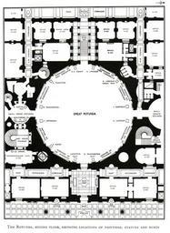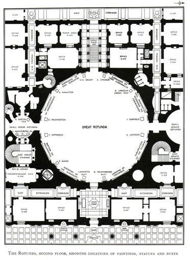 Keywords: USCapitolBuildingRotundaDetail.jpg en Floor plan of the central area of the U S Capitol building around the Rotunda The caption to this image in the source book states The Rotunda second floor showing locations of paintings statues and busts North is to the left the Senate wing ; the upward direction is west toward the Mall; south is to the right the House of Representatives wing ; down is to the east toward the Visitors Center the Supreme Court building and the Library of Congress building Art of the United States Capitol page 426 The Rotunda second floor showing locations of paintings statues and busts Washington D C U S Government Printing Office 1978 Author A detail from this image showing just the Rotunda room itself File USCapitolBuildingRotunda jpg United States Capitol rotunda PD-USGov |