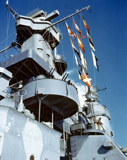 Keywords: USS Alabama (BB-60) - 80-G-K-495.jpg View of the ship's forward superstructure looking up from the port side during her shakedown period circa December 1942 Note Signal flags; Mk 8 fire control radar on Mk 38 main battery gun director at top ; Mk 4 fire control radar on Mk 37 secondary battery gun director at right; radio direction finder loop at left Official U S Navy Photograph now in the collections of the National Archives depicted place http //www history navy mil/our-collections/photography html USS Alabama BB-60 - 80-G-K-495 tiff 100 PD-USGov-Military-Navy NHHC images uploaded by Revent 80-G-K-495 Images from the Naval History and Heritage Command 80-G-K-495 USS Alabama BB-60 World War II color photographs of the war in the Atlantic |
