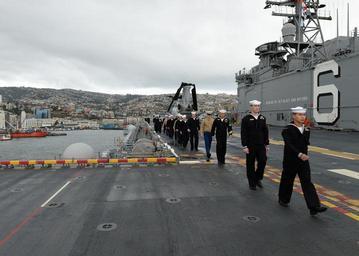 | Keywords: USS America arrives in Valparaiso 140824-N-FR671-058.jpg en Sailors and Marines aboard future amphibious assault ship USS America LHA 6 prepare to man the rails as the ship gets ready to moor in Valparaiso Chile for a scheduled port visit America is currently traveling through the U S Southern Command and U S 4th Fleet area of responsibility on her maiden transit America visits the Americas America is the first ship of its class replacing the Tarawa-class of amphibious assault ships As the next generation big-deck amphibious assault ship America is optimized for aviation capable of supporting current and future aircraft such as the MV-22 Osprey and F-35B Joint Strike Fighter The ship is scheduled to be ceremoniously commissioned Oct 11 in San Francisco U S Navy photo by Mass Communication Specialist 2nd Class Jonathan A Colon/Released 2014-08-24 Jonathan Colon https //www dvidshub net/image/1521709 140824-N-FR671-058 2014-08-25 17 27 VALPARAISO CL PD-USGov-Military-Navy MV-22B Osprey USS America LHA-6 Images from DoD uploaded by Fæ |