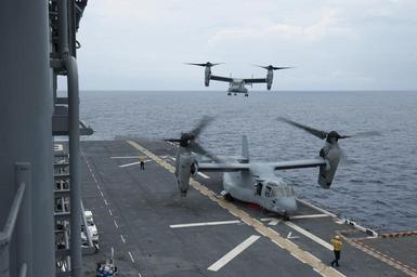 | Keywords: USS America receives distinguished visitors from El Salvador 140908-N-LQ799-113.jpg en A tiltrotor MV-22 Osprey assigned to the Argonauts of Marine Operational Test and Evaluation Squadron VMX 22 transporting distinguished visitors from El Salvador prepares to land aboard future amphibious assault ship USS America LHA 6 America is currently traveling through the U S Southern Command and U S 4th Fleet area of responsibility on its maiden transit America Visits the Americas America is the first ship of its class replacing the Tarawa-class of amphibious assault ships As the next generation big-deck amphibious assault ship America is optimized for aviation capable of supporting current and future aircraft such as the Osprey and F-35B Joint Strike Fighter The ship is scheduled to be ceremoniously commissioned Oct 11 in San Francisco U S Navy photo by Mass Communication Specialist 1st Class Lewis Hunsaker/Released 2014-09-08 Petty Officer 1st Class Lewis Hunsaker https //www dvidshub net/image/1548566 140908-N-LQ799-113 2014-09-13 20 31 USS AMERICA AT SEA PD-USGov-Military-Navy MV-22B Osprey USS America LHA-6 Images from DoD uploaded by Fæ |