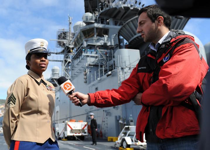| Keywords: USS America tour 140824-N-CC789-149.jpg en U S Marine Sgt Kimberly Barton answers a question from a local reporter during a press conference on the flight deck of future amphibious assault ship USS America LHA 6 shortly after the ship moored in Valparaiso Chile for a scheduled port visit America is currently traveling through the U S Southern Command and U S 4th Fleet area of responsibility on her maiden transit America visits the Americas America is the first ship of its class replacing the Tarawa-class of amphibious assault ships As the next generation big-deck amphibious assault ship America is optimized for aviation capable of supporting current and future aircraft such as the MV-22 Osprey and F-35B Joint Strike Fighter The ship is scheduled to be ceremoniously commissioned Oct 11 in San Francisco U S Navy photo by Mass Communication Specialist 1st Class Vladimir Ramos/Released 2014-08-24 Canadian Forces PO 1 VLADIMIR RAMOS https //www dvidshub net/image/1522073 140824-N-CC789-149 2014-08-26 02 19 VALPARAISO CL PD-USGov-Military-Navy MV-22B Osprey USS America LHA-6 Images from DoD uploaded by Fæ |