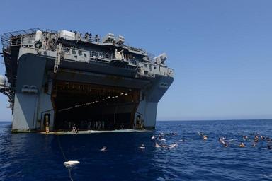 Keywords: USS Bataan swim call 140614-N-JX484-339.jpg en Sailors and Marines from the multipurpose amphibious assault ship USS Bataan LHD 5 participate in a swim call June 14 Bataan with elements of the 22nd Marine Expeditionary Unit is operating in the U S 6th Fleet area of operations to augment U S crisis response forces in the region U S Navy photo by Mass Communication Specialist 3rd Class Mark Hays/Released <br>Unit USS Bataan LHD 5 2014-06-14 Petty Officer 3rd Class Mark Hays https //www dvidshub net/image/1405378/uss-bataan-swim-call 140614-N-JX484-339 2014-06-18 05 40 MEDITERRANEAN SEA PD-USGov-Military-Navy USS Bataan LHD-5 22nd Marine Expeditionary Unit Images from DoD uploaded by Fæ |