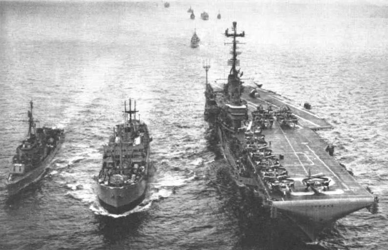 | Keywords: USS Bennington (CVS-20) underway with escorts 1962.jpg The Royal Fleet Auxiliary RFA Fort Dunvegan A160 replenishes the U S Navy aircraft carrier USS Bennington CVS-20 and the destroyer USS Epperson DD-719 during the SEATO ASW exercise Sea Devil in the Coral Sea in 1962 The Bennington with assigned Carrier Anti-submarine Air Group 59 CVSG-59 was deployed to the Western Pacific from 7 January to 25 July 1962 http //navalaviationnews navylive dodlive mil/ U S Navy Naval Aviation News/http //www history navy mil/nan/backissues/newbackissues htm http //www history navy mil/nan/backissues/1960s/1962/Jul62 pdf July 1962 p 14 1962 USN PD-USGov-Military-Navy USS Bennington CV-20 USS Epperson DD-719 Royal Fleet Auxiliary ships 1960s military exercises |