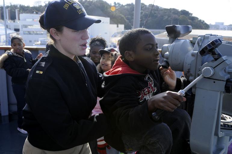 Keywords: USS Blue Ridge DVIDS239903.jpg en Ensign Jamie Howe lifts a child from The Sullivans Elementary School to look at Yokosuka Naval Base through the big eyes during a tour of U S 7th Fleet flagship USS Blue Ridge Blue Ridge serves under Commander Expeditionary Strike Group 7 and Combined Task Force 76 the Navy's only forward-deployed amphibious force 2010-01-13 Seaman Brian Stone https //www dvidshub net/image/239903 100113-N-+++++-404 2010-01-15 01 08 YOKOSUKA JP PD-USGov-Military-Navy USS Blue Ridge LCC-19 Images from DoD uploaded by Fæ |