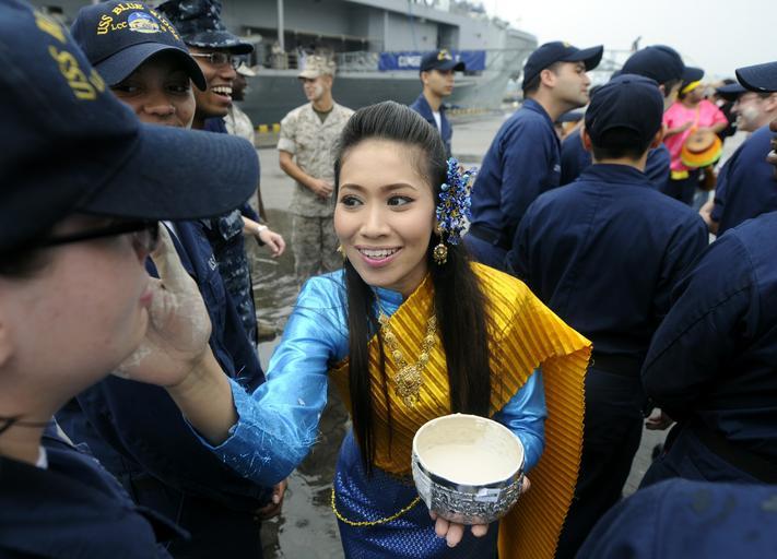 Keywords: USS Blue Ridge DVIDS271086.jpg en Thai dancers in traditional dress perform a cleansing ritual for Sailors assigned to the U S 7th Fleet command ship USS Blue Ridge during Songkran festival or Thai New Year as Blue Ridge arrives in Pattaya Thailand Sailors and Marines aboard Blue Ridge offloaded boxes of toys shoes and clothing to be delivered as part of project Goodwill 2010-04-17 Petty Officer 3rd Class Daniel Viramontes https //www dvidshub net/image/271086 100417-N-+++++-204 2010-04-19 23 21 PATTAYA TH PD-USGov-Military-Navy Pattaya USS Blue Ridge LCC-19 Images from DoD uploaded by Fæ |